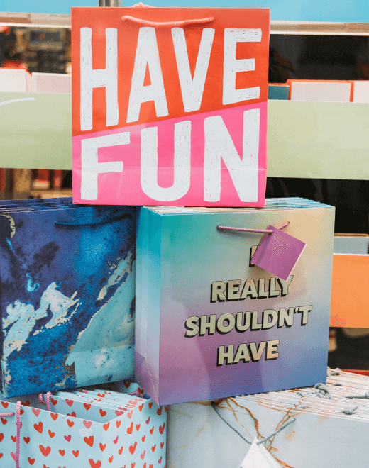 Branded bags, boxes, stickers, and wrapping paper.